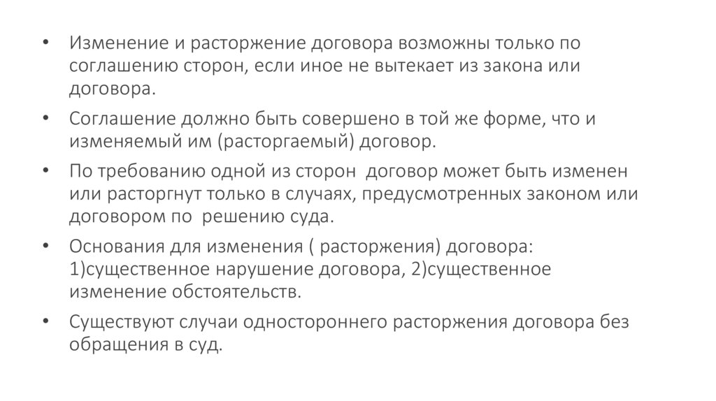 • Изменение и расторжение договора возможны только посоглашению сторон, если иное не вытекает из закона или