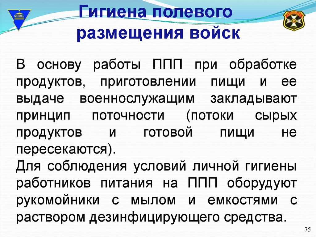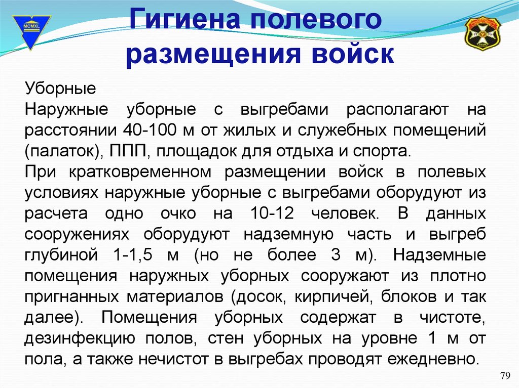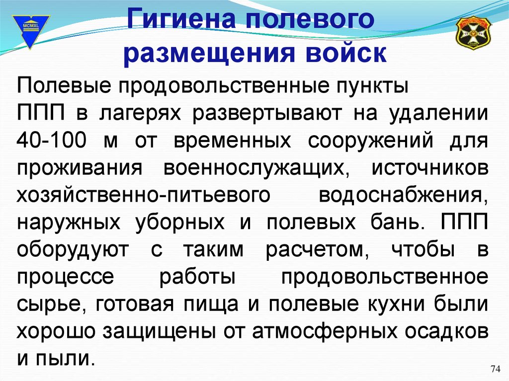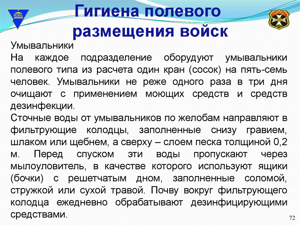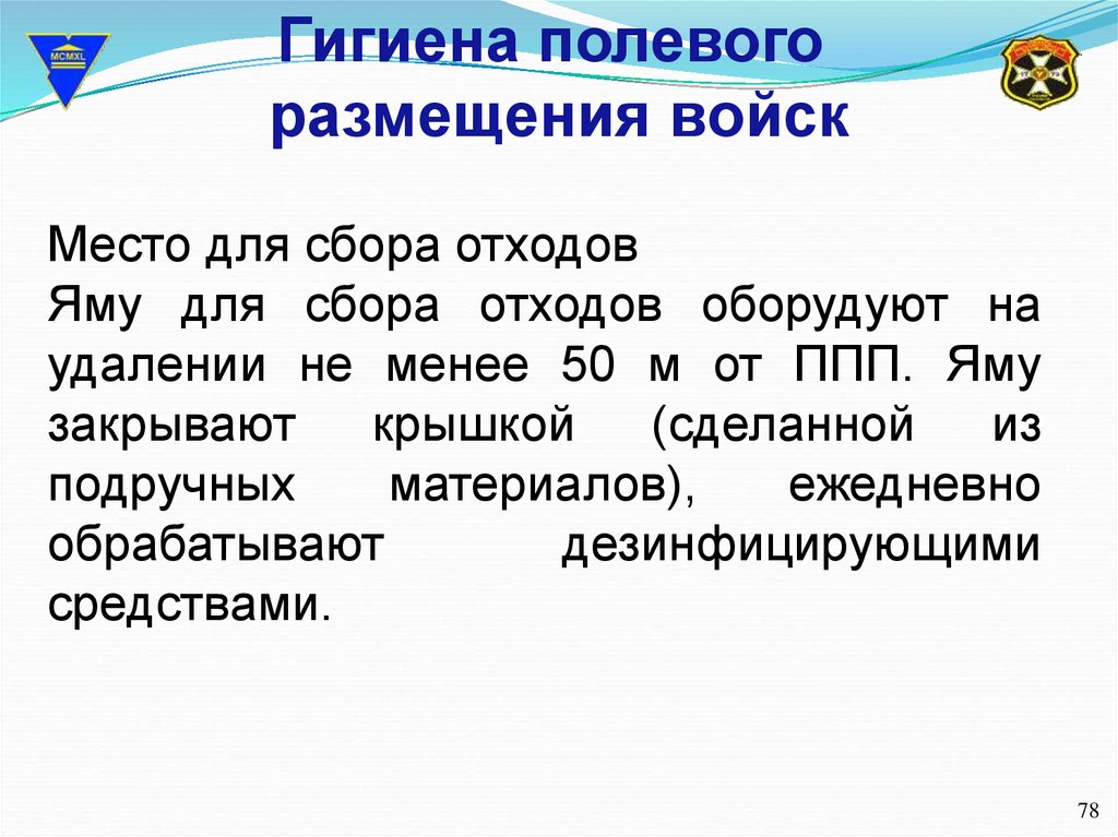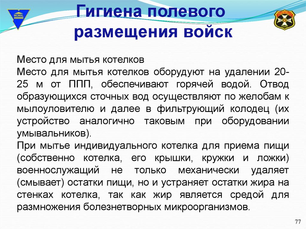 Место для мытья котелков оборудуют на удалении 2025 м от ППП, обеспечивают горячей водой. Отвод