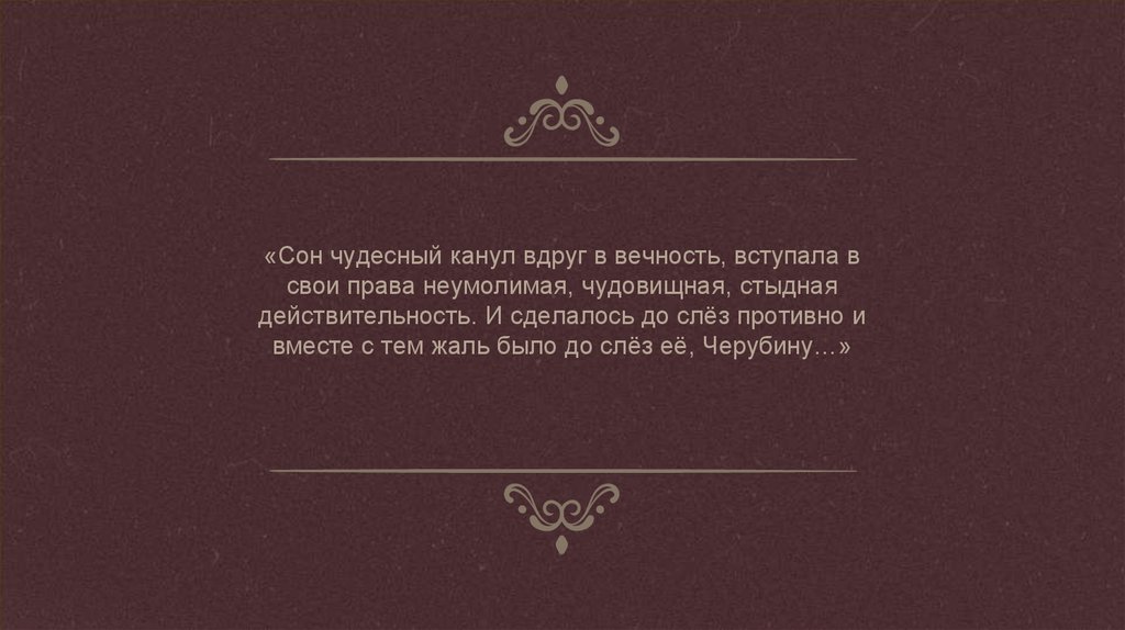 «Сон чудесный канул вдруг в вечность, вступала всвои права неумолимая, чудовищная, стыдная