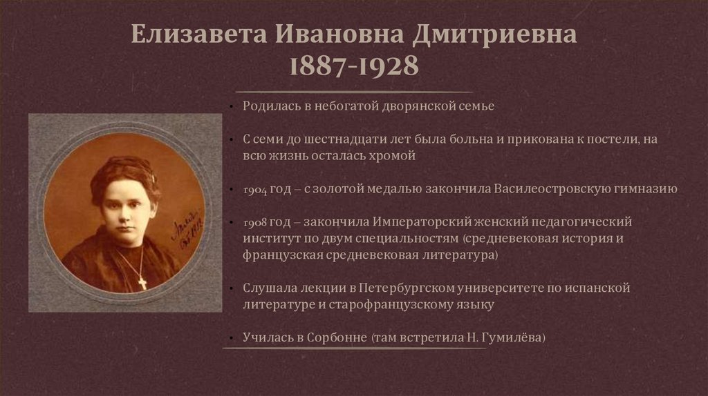 Училась в Сорбонне (там встретила Н. Гумилёва)