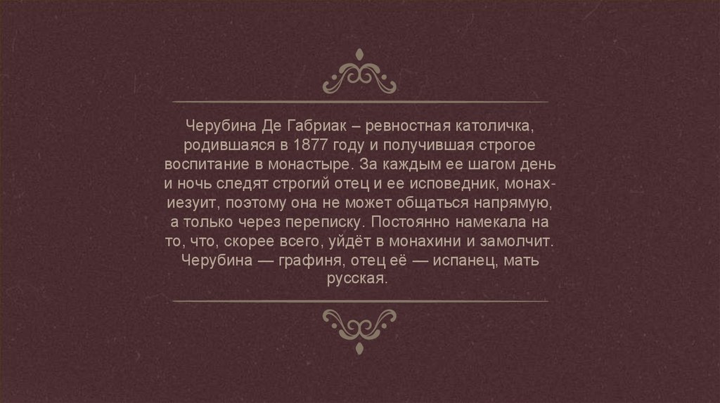 Черубина Де Габриак – ревностная католичка,родившаяся в 1877 году и получившая строгое