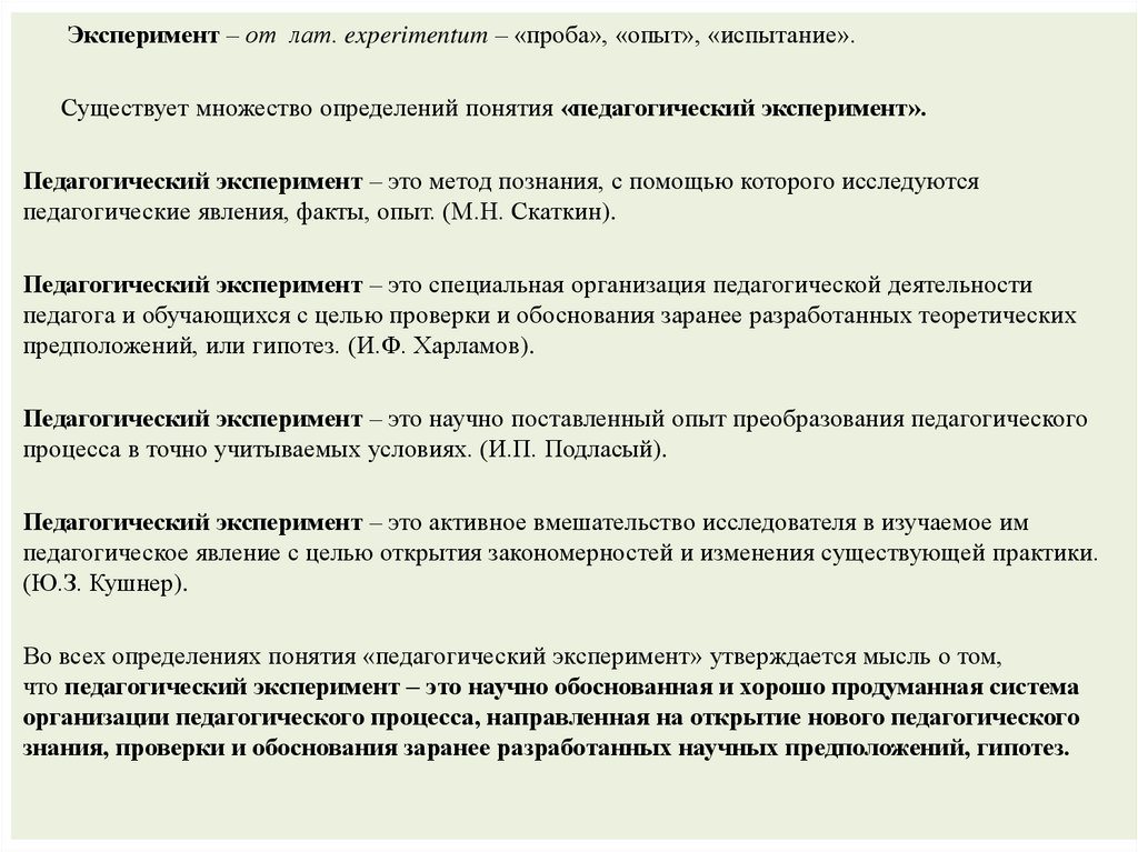 Во всех определениях понятия «педагогический эксперимент» утверждается мысль о том,