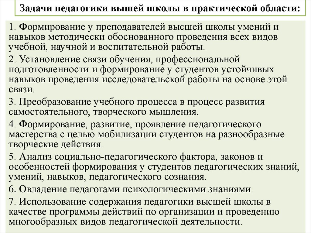 Задачи педагогики вышей школы в практической области:1. Формирование у преподавателей высшей школы умений и