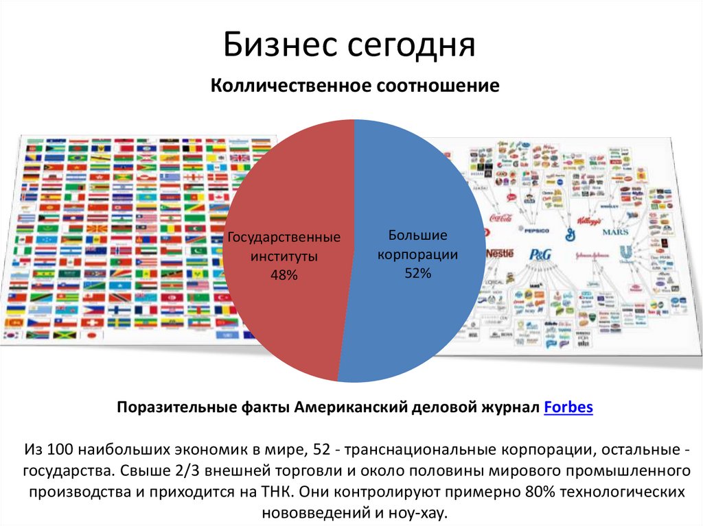 Из 100 наибольших экономик в мире, 52 - транснациональные корпорации, остальные государства. Свыше 2/3 внешней торговли и около половины мирового промышленного