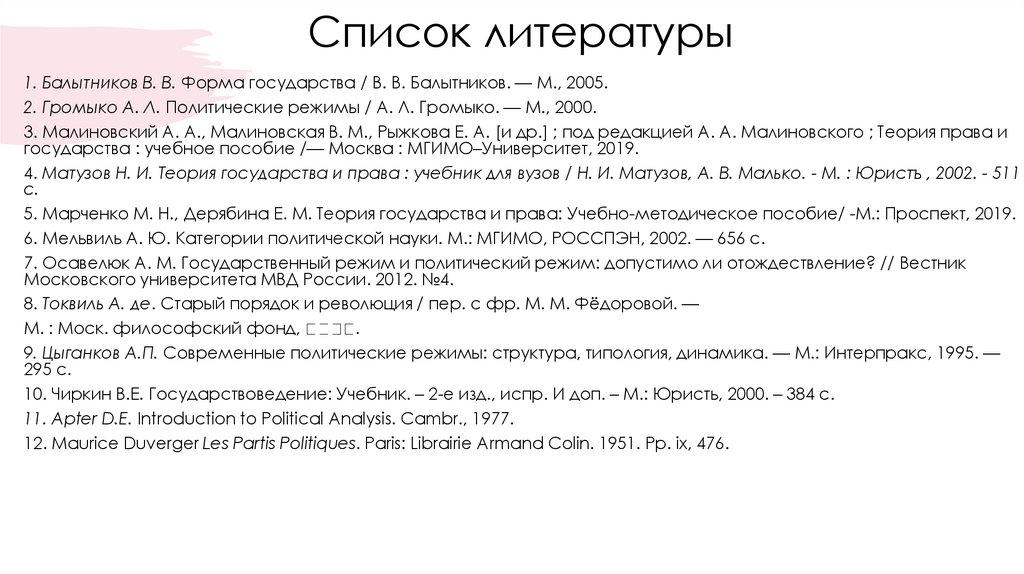 Список литературы1. Балытников В. В. Форма государства / В. В. Балытников. — М., 2005.