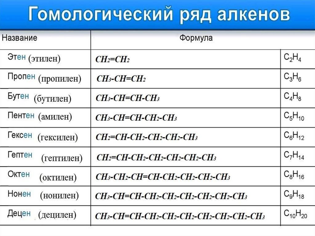 Назовите первых 9 представителей гомологического ряда алкенов?