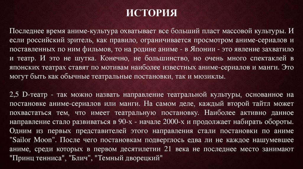 ИСТОРИЯПоследнее время аниме-культура охватывает все больший пласт массовой культуры. И