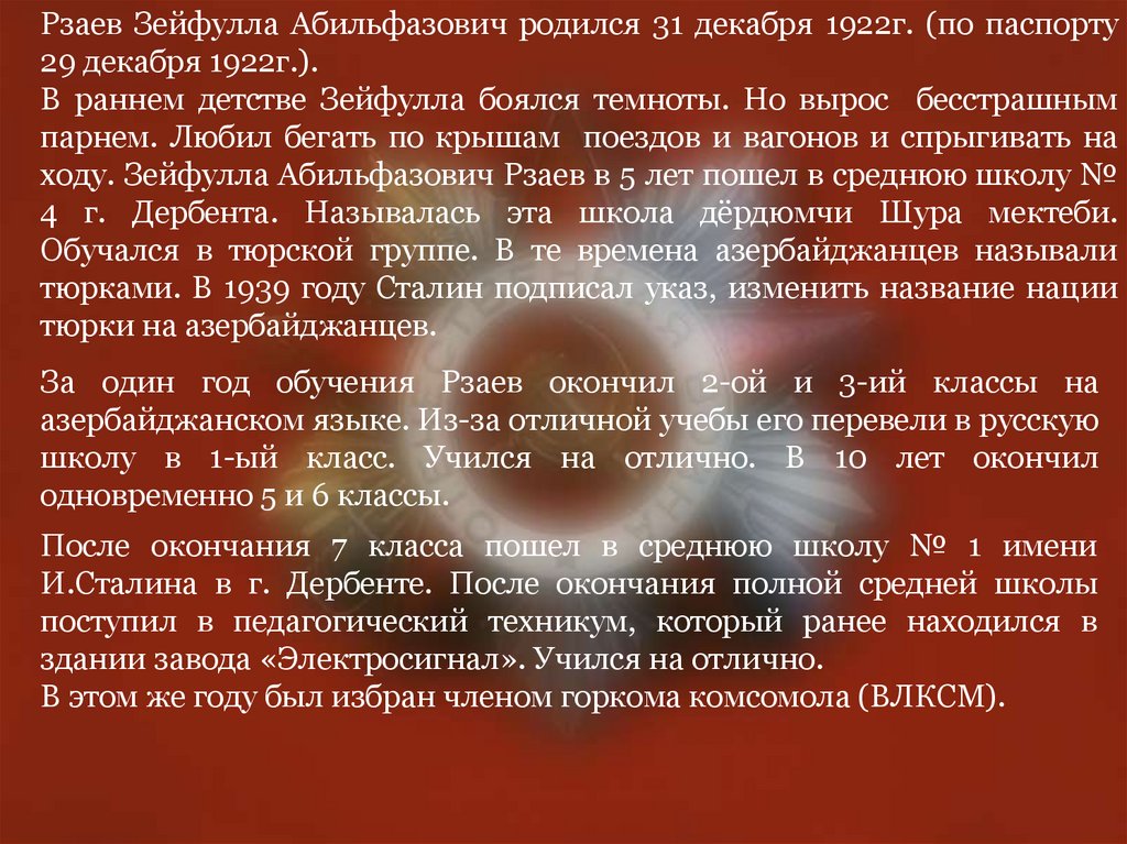 Рзаев Зейфулла Абильфазович родился 31 декабря 1922г. (по паспорту29 декабря 1922г.).