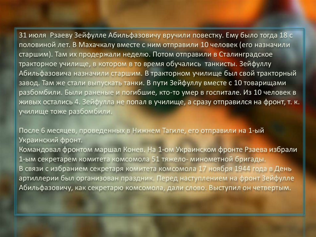 31 июля Рзаеву Зейфулле Абильфазовичу вручили повестку. Ему было тогда 18 споловиной лет. В Махачкалу вместе с ним отправили 10 человек (его назначили