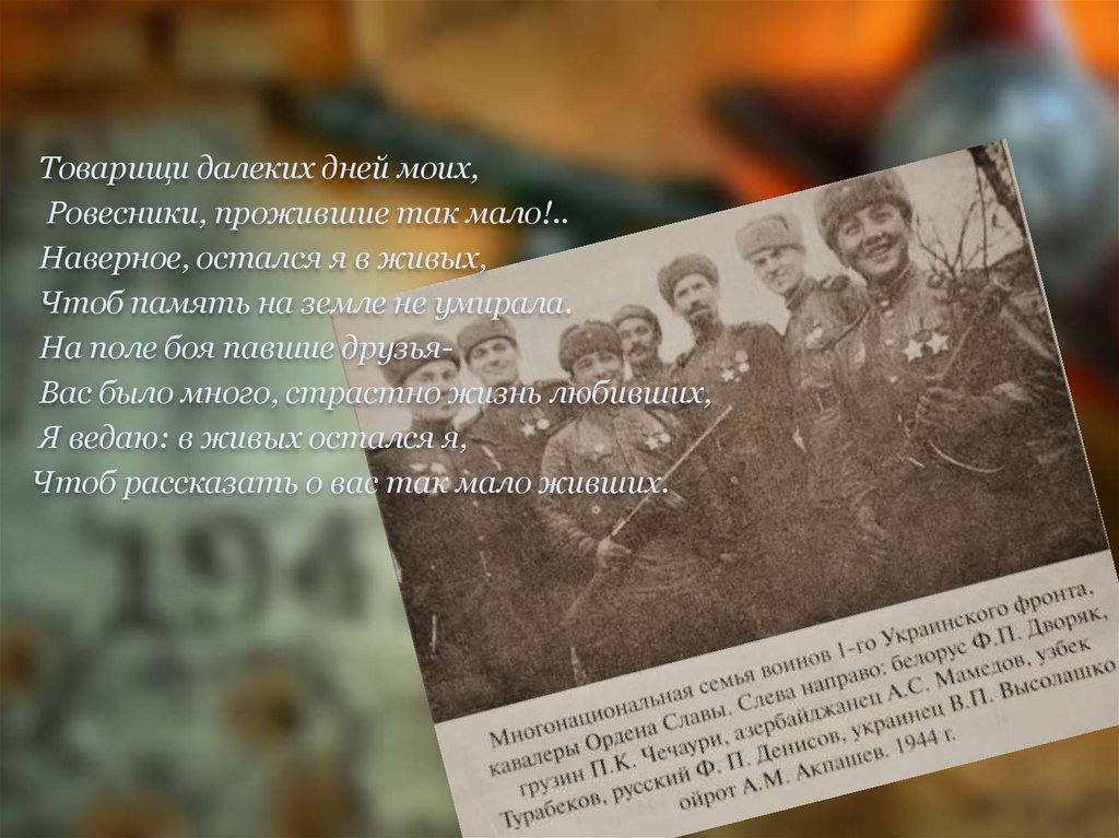 Товарищи далеких дней моих,Ровесники, прожившие так мало!..