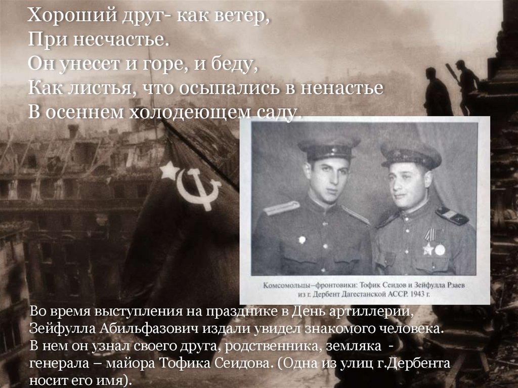 В нем он узнал своего друга, родственника, земляка генерала – майора Тофика Сеидова. (Одна из улиц г.Дербента