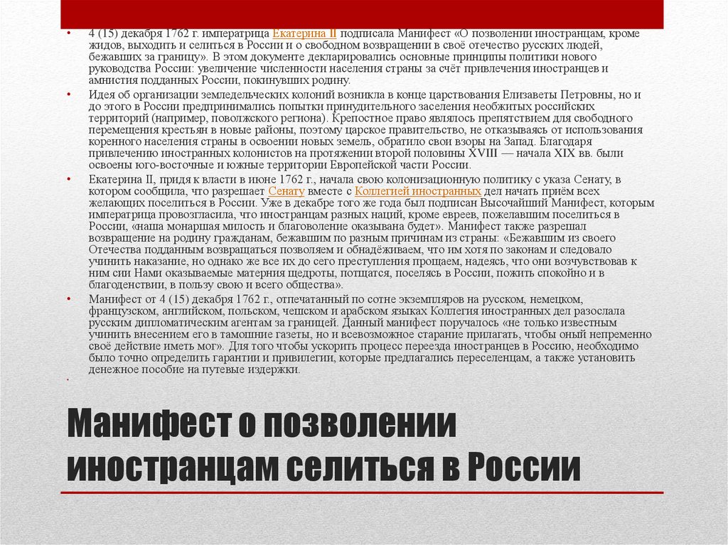 заселить малообжитые районы Российской империи иностранцами.Манифест призывал