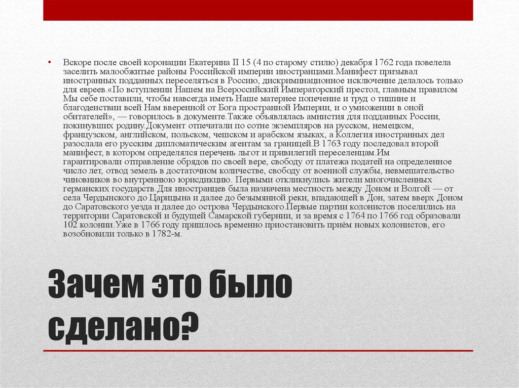 4 (15) декабря 1762 г. императрица Екатерина II подписала Манифест «О позволении иностранцам, кроме