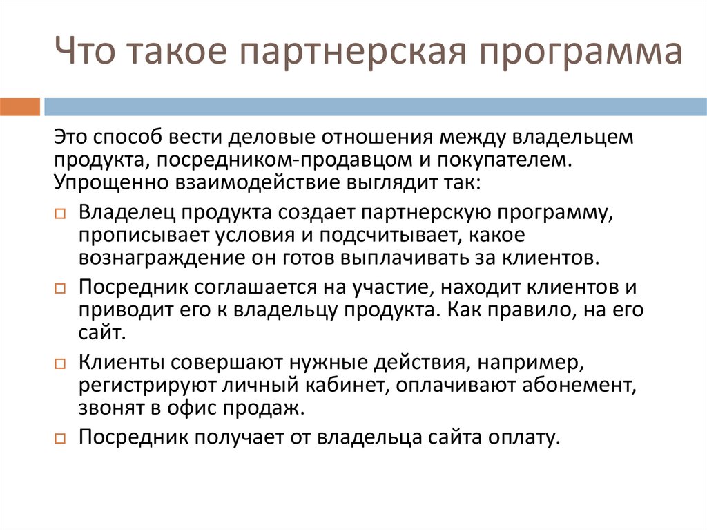 Что такое партнерская программаЭто способ вести деловые отношения между владельцем