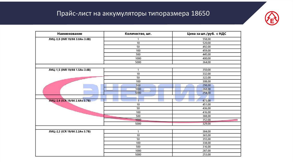 Прайс-лист на аккумуляторы типоразмера 18650Наименование