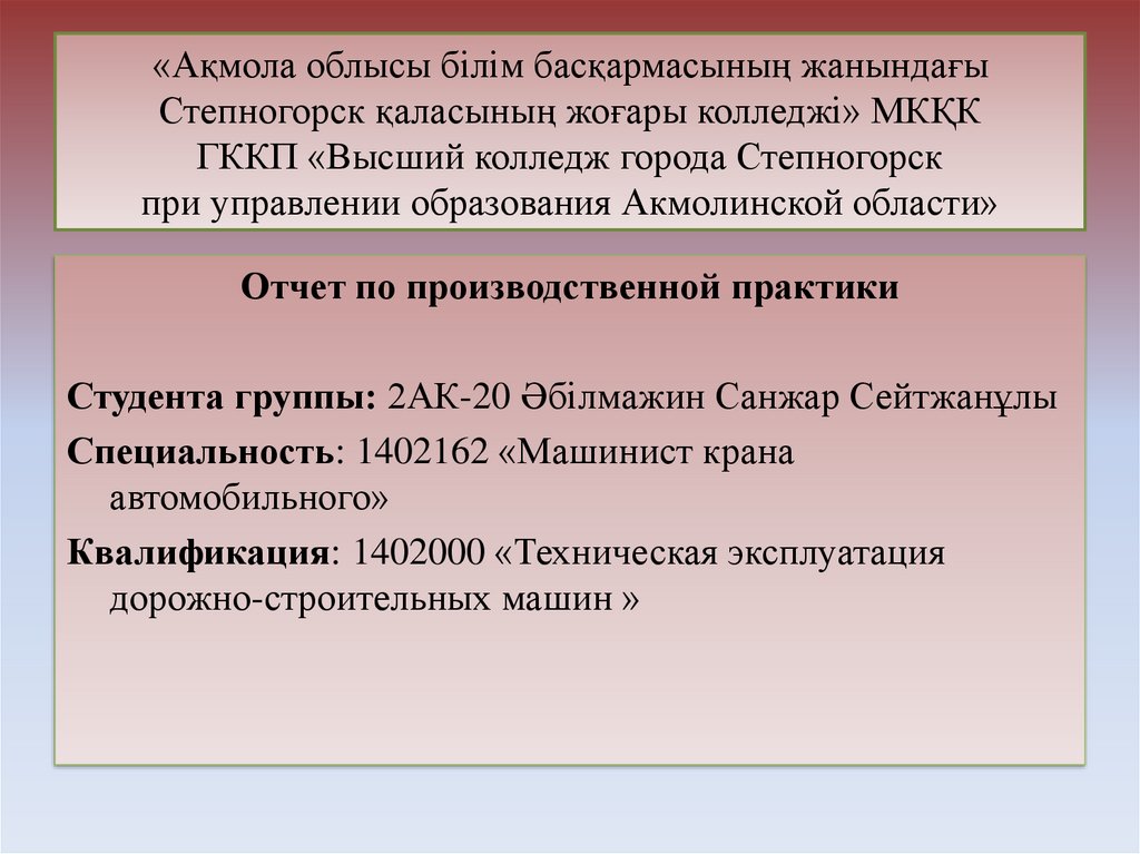 «Ақмола облысы білім басқармасының жанындағыСтепногорск қаласының жоғары колледжі» МКҚК
