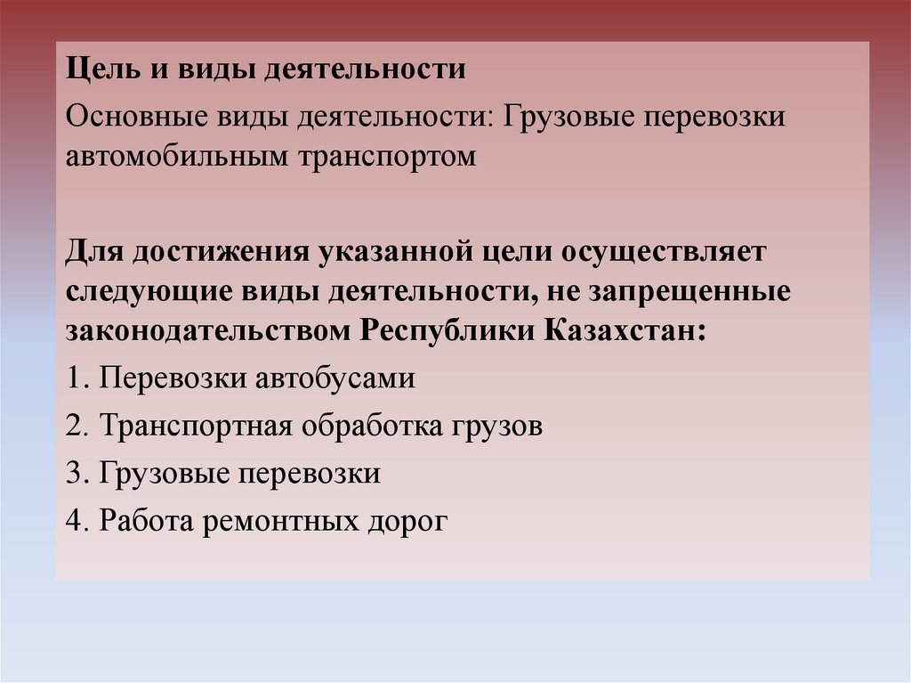 Цель и виды деятельностиОсновные виды деятельности: Грузовые перевозки