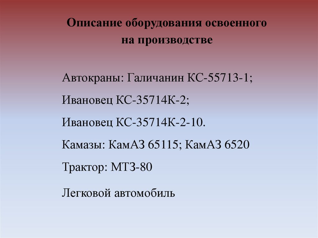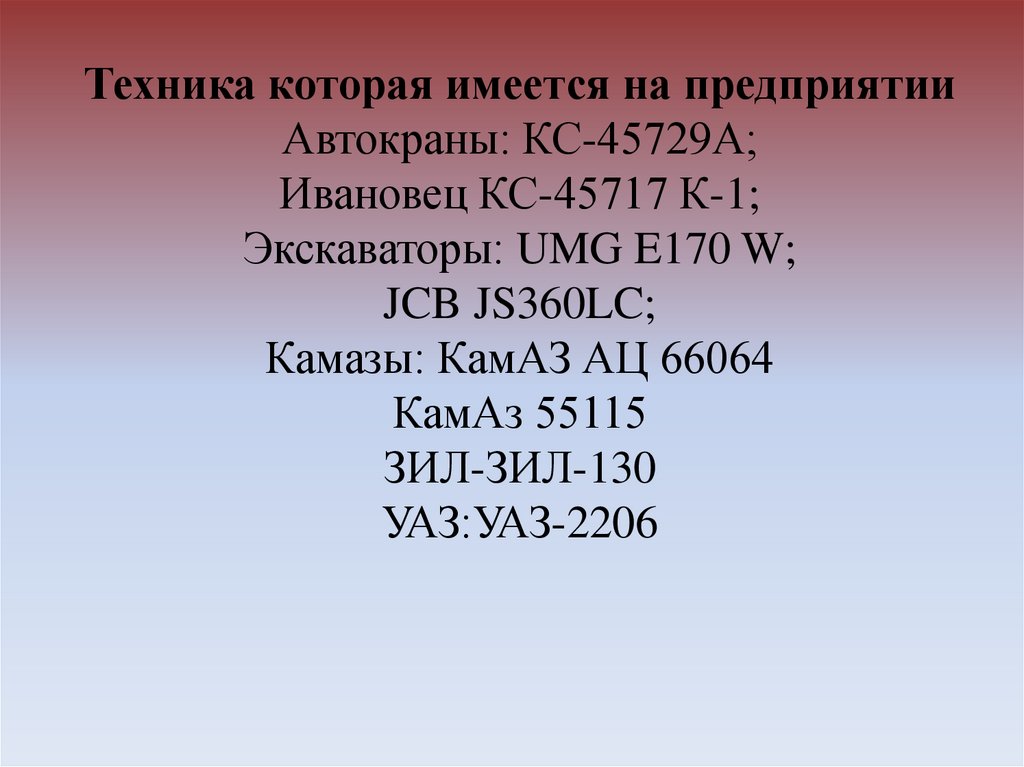 Техника которая имеется на предприятииАвтокраны: КС-45729А;