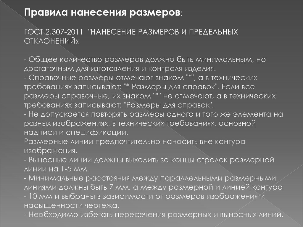 Правила нанесения размеров:ГОСТ 2.307-2011 "НАНЕСЕНИЕ РАЗМЕРОВ И ПРЕДЕЛЬНЫХ