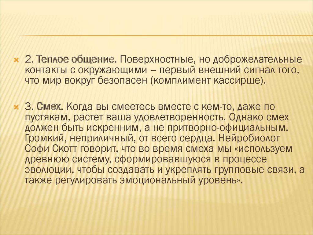 2. Теплое общение. Поверхностные, но доброжелательныеконтакты с окружающими – первый внешний сигнал того,