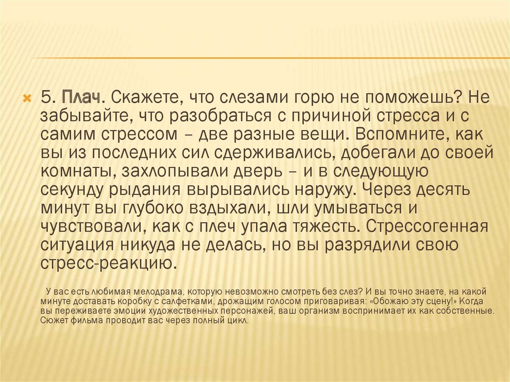 5. Плач. Скажете, что слезами горю не поможешь? Незабывайте, что разобраться с причиной стресса и с