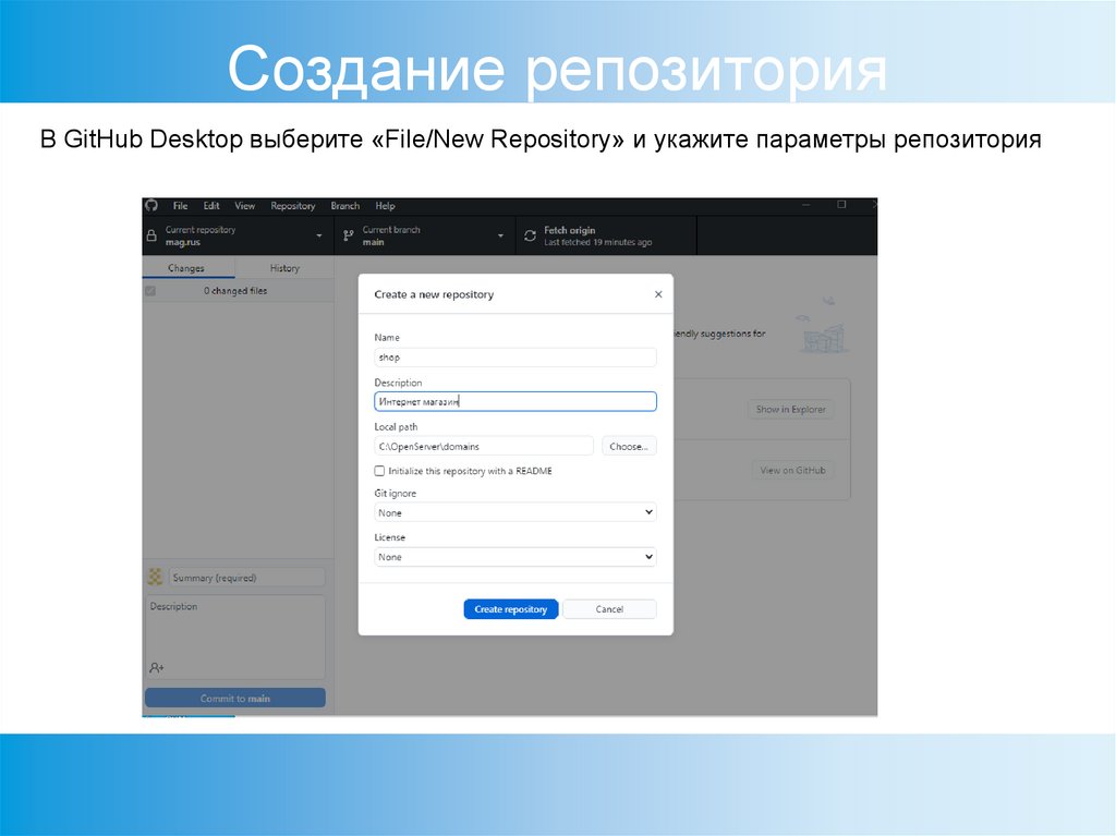 Создание репозиторияВ GitHub Desktop выберите «File/New Repository» и укажите параметры репозитория