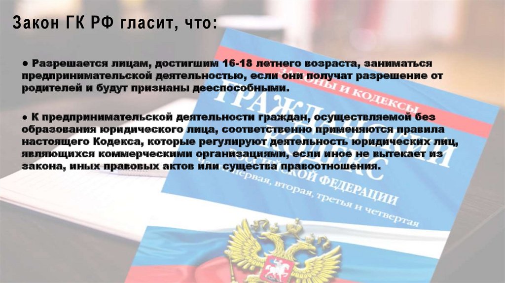 Закон ГК РФ гласит, что:● Разрешается лицам, достигшим 16-18 летнего возраста, заниматься