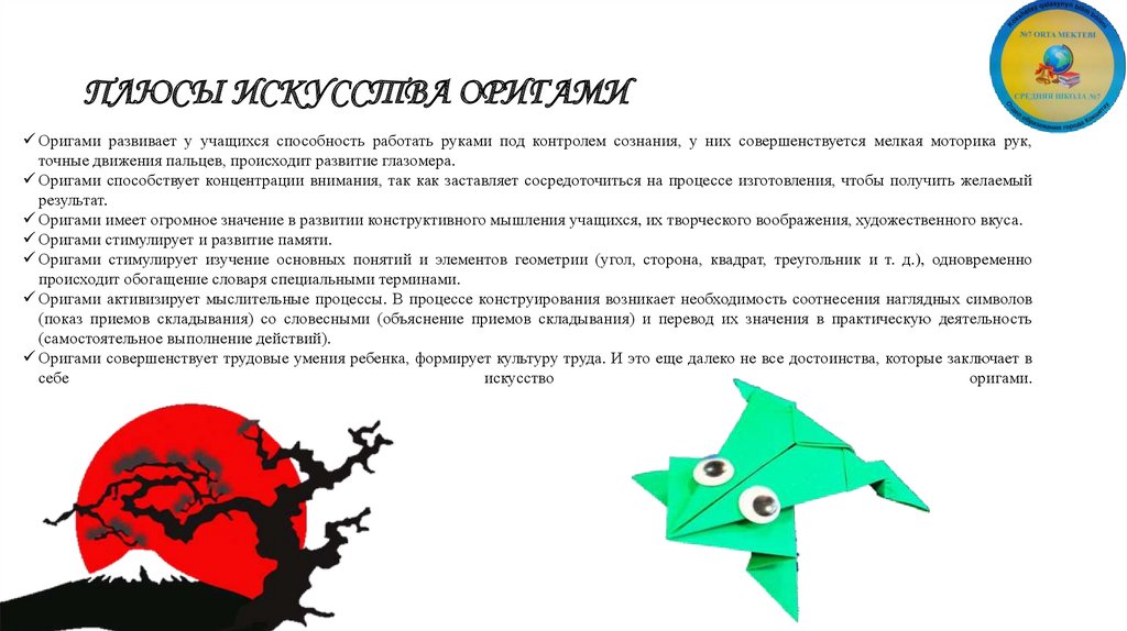 ПЛЮСЫ ИСКУССТВА ОРИГАМИОригами развивает у учащихся способность работать руками под контролем сознания, у них совершенствуется мелкая моторика рук,