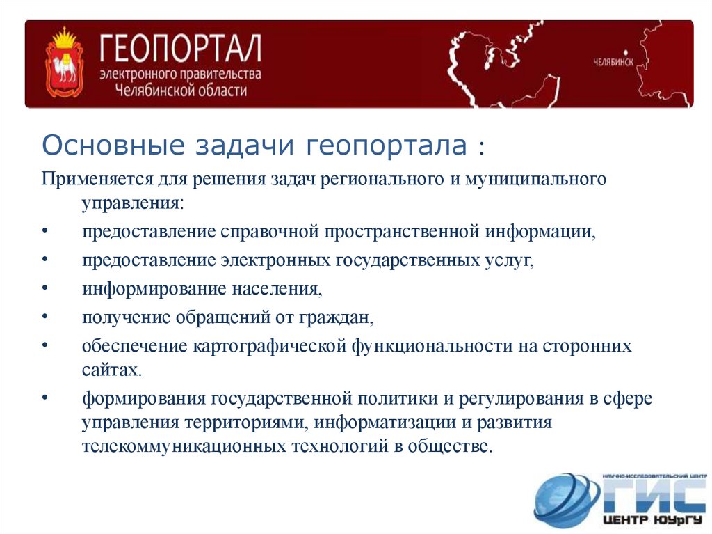 Основные задачи геопортала :Применяется для решения задач регионального и муниципального