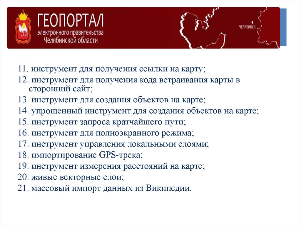 11. инструмент для получения ссылки на карту;12. инструмент для получения кода встраивания карты в