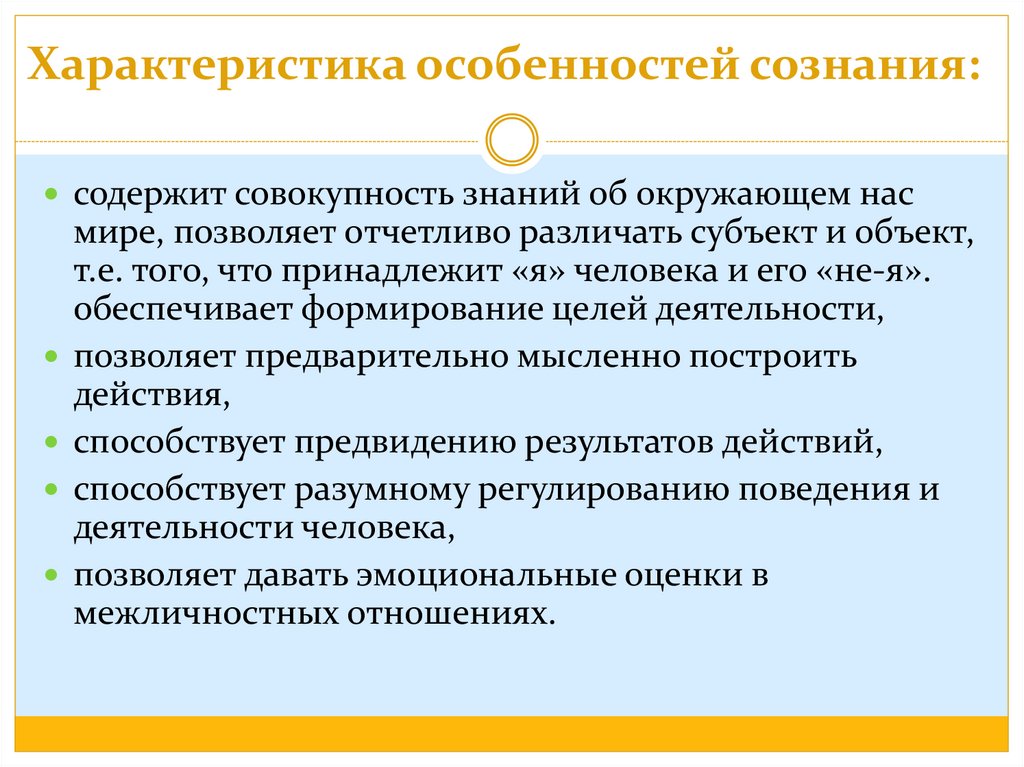 Характеристика особенностей сознания:содержит совокупность знаний об окружающем нас