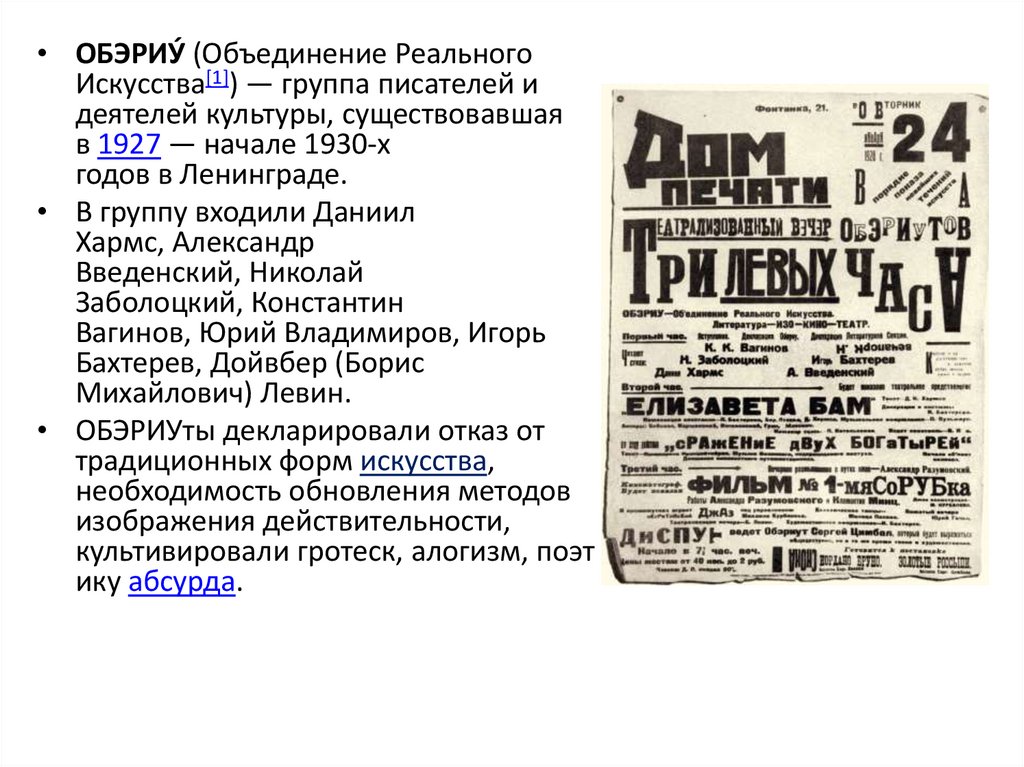 • ОБЭРИУ́ (Объединение РеальногоИскусства[1]) — группа писателей и