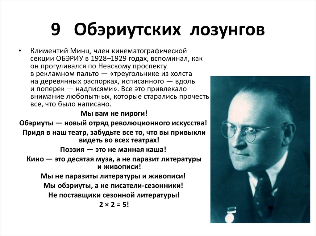 9 Обэриутских лозунговКлиментий Минц, член кинематографической