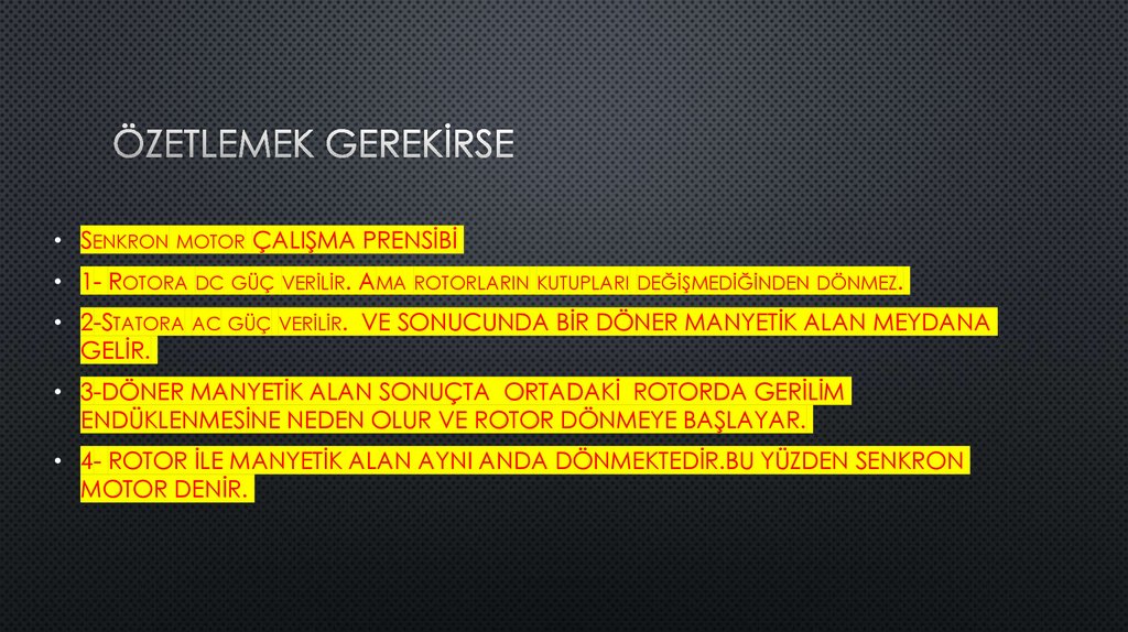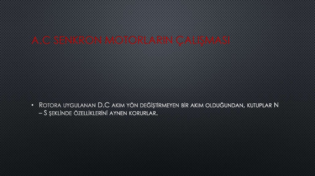 • SENKRON MOTOR ÇALIŞMA PRENSİBİ• 1- ROTORA DC GÜÇ VERİLİR. AMA ROTORLARIN KUTUPLARI