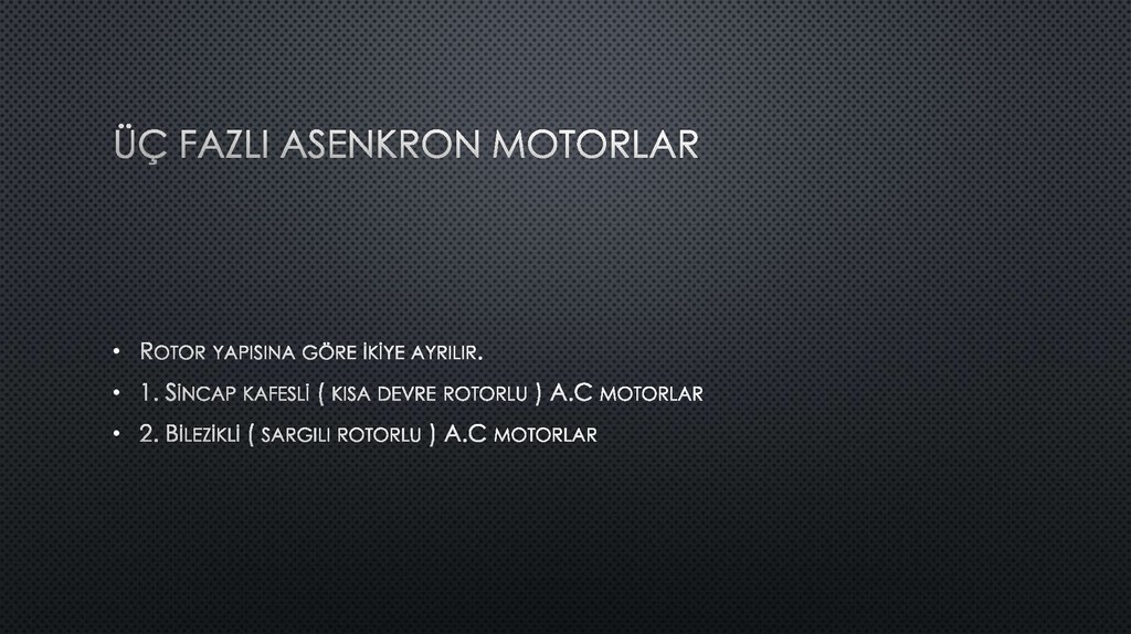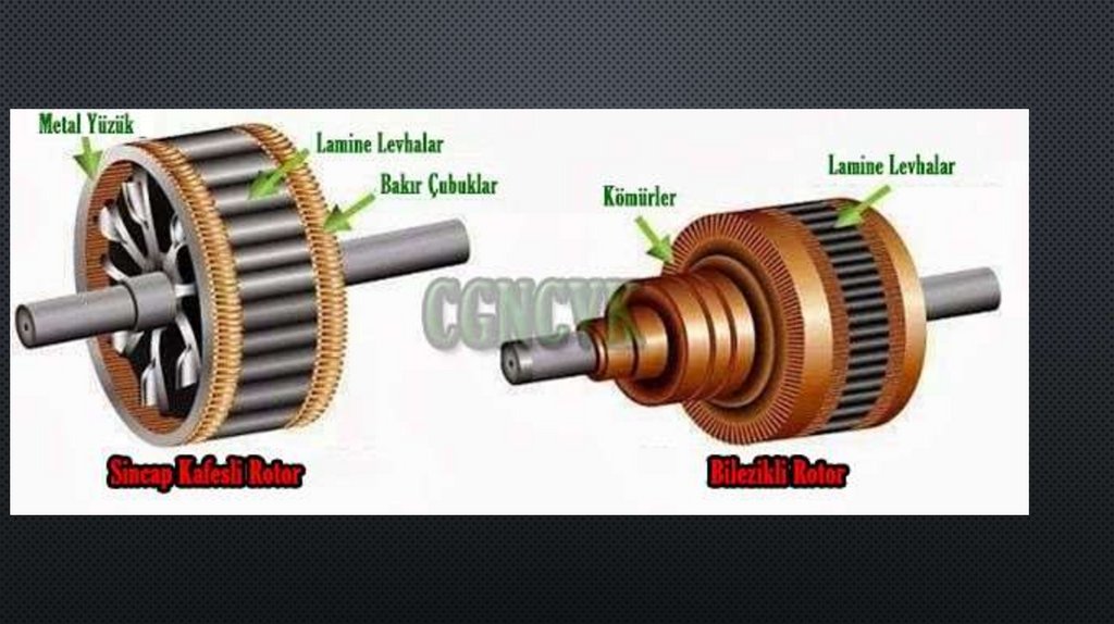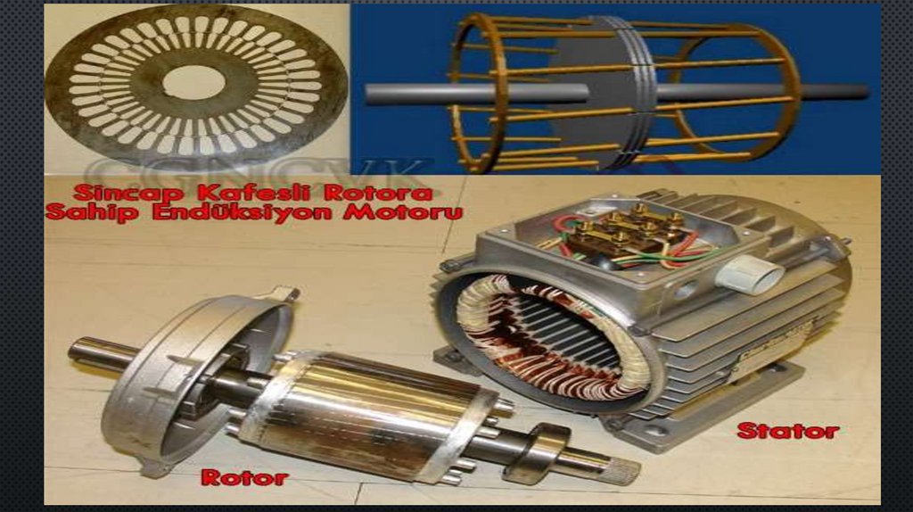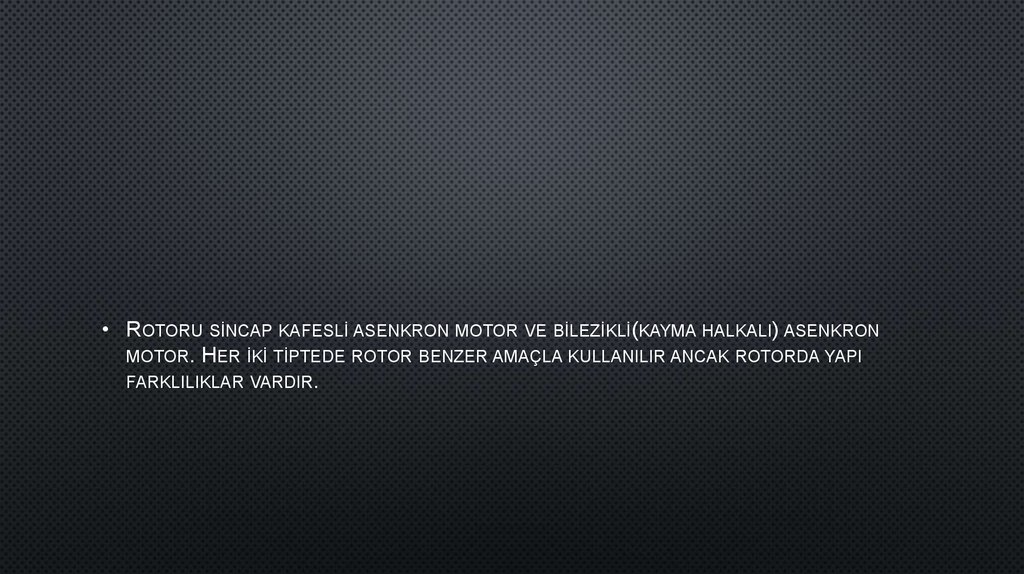 • ROTORU SİNCAP KAFESLİ ASENKRON MOTOR VE BİLEZİKLİ(KAYMA HALKALI) ASENKRONMOTOR. HER İKİ TİPTEDE ROTOR BENZER AMAÇLA KULLANILIR ANCAK ROTORDA YAPI