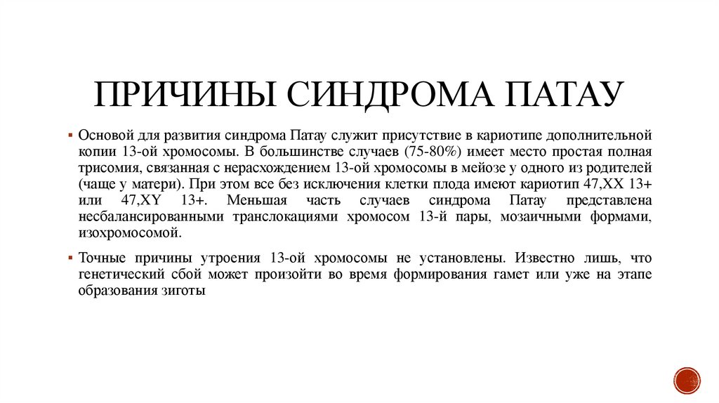 ПРИЧИНЫ СИНДРОМА ПАТАУОсновой для развития синдрома Патау служит присутствие в кариотипе дополнительной