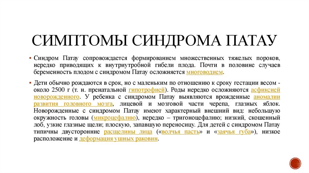 СИМПТОМЫ СИНДРОМА ПАТАУСиндром Патау сопровождается формированием множественных тяжелых пороков,