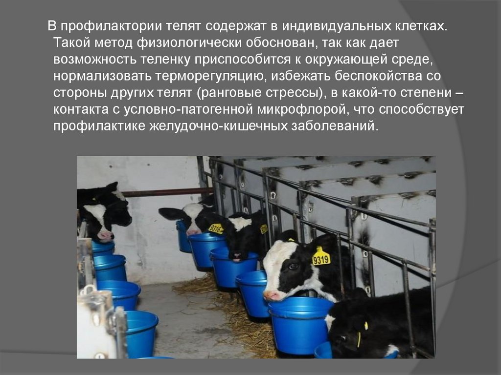 В профилактории телят содержат в индивидуальных клетках.Такой метод физиологически обоснован, так как дает