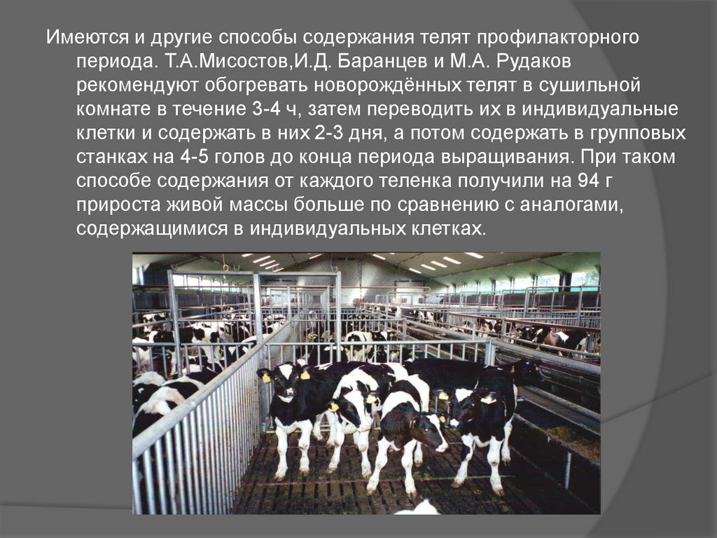 Имеются и другие способы содержания телят профилакторногопериода. Т.А.Мисостов,И.Д. Баранцев и М.А. Рудаков
