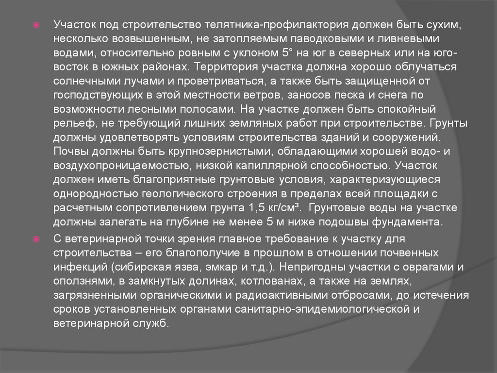 Участок под строительство телятника-профилактория должен быть сухим,несколько возвышенным, не затопляемым паводковыми и ливневыми