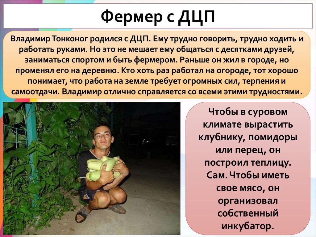 Фермер с ДЦПВладимир Тонконог родился с ДЦП. Ему трудно говорить, трудно ходить и
