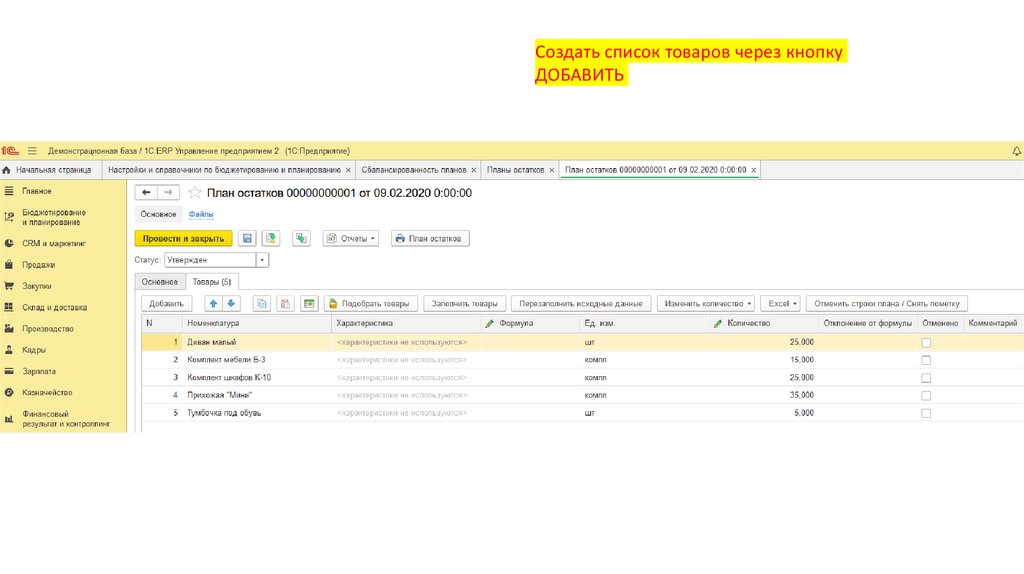 Создать список товаров через кнопкуДОБАВИТЬ