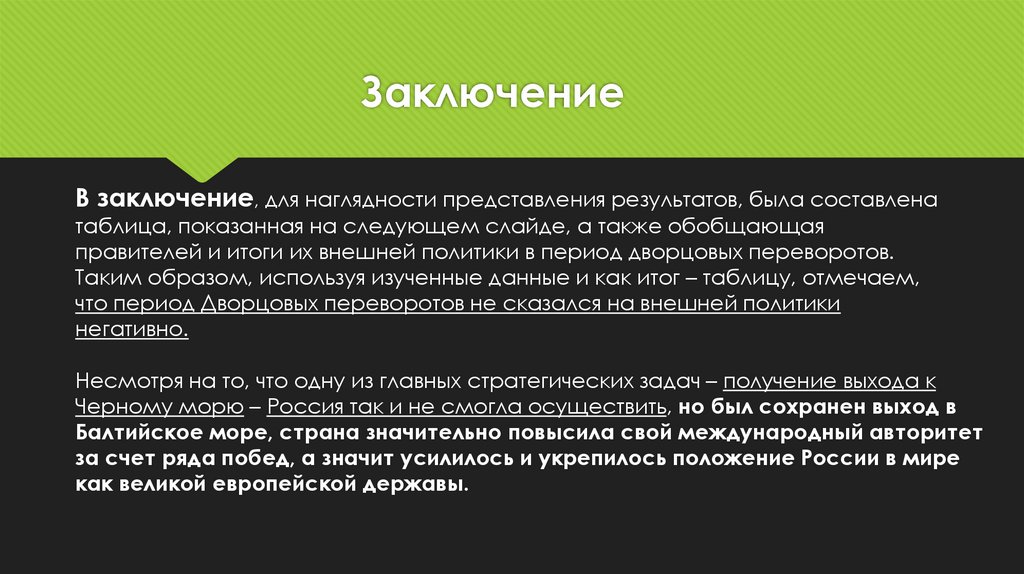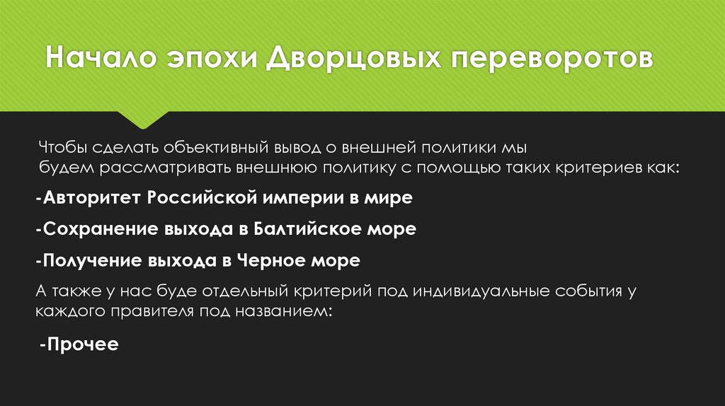Начало эпохи Дворцовых переворотовЧтобы сделать объективный вывод о внешней политики мы
