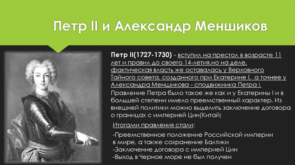 Петр II и Александр МеншиковПетр II(1727-1730) - вступил на престол в возрасте 11