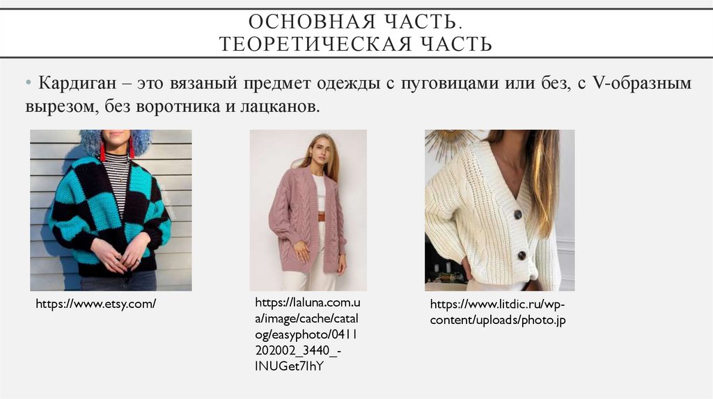 • Кардиган – это вязаный предмет одежды с пуговицами или без, с V-образным