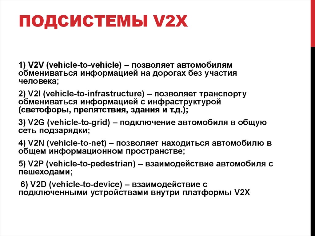 ПОДСИСТЕМЫ V2X1) V2V (vehicle-to-vehicle) – позволяет автомобилям