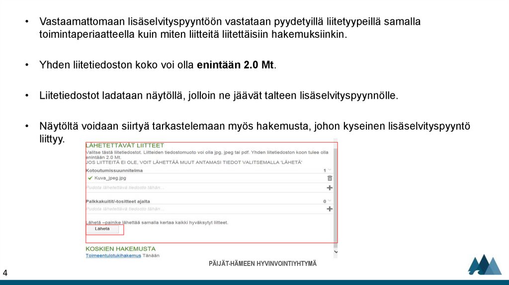• Vastaamattomaan lisäselvityspyyntöön vastataan pyydetyillä liitetyypeillä samallatoimintaperiaatteella kuin miten liitteitä liitettäisiin hakemuksiinkin.