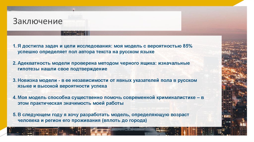 Заключение1. Я достигла задач и цели исследования: моя модель с вероятностью 85%