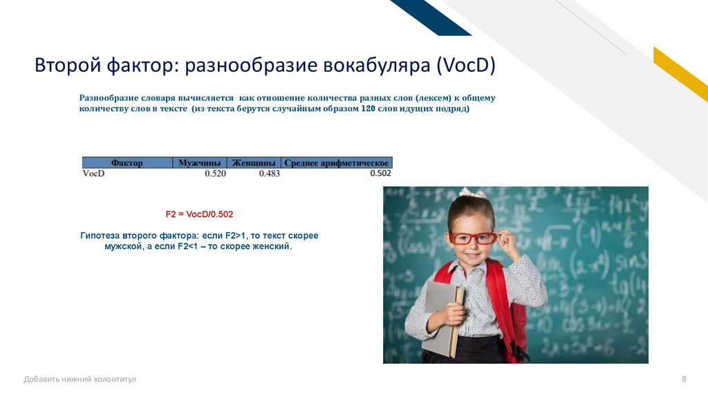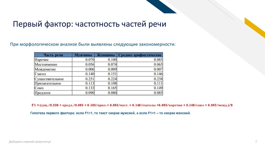 Гипотеза первого фактора: если F1>1, то текст скорее мужской, а если F1<1 – то скорее женский.