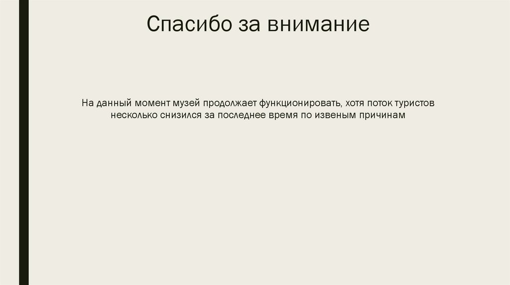 Спасибо за вниманиеНа данный момент музей продолжает функционировать, хотя поток туристов